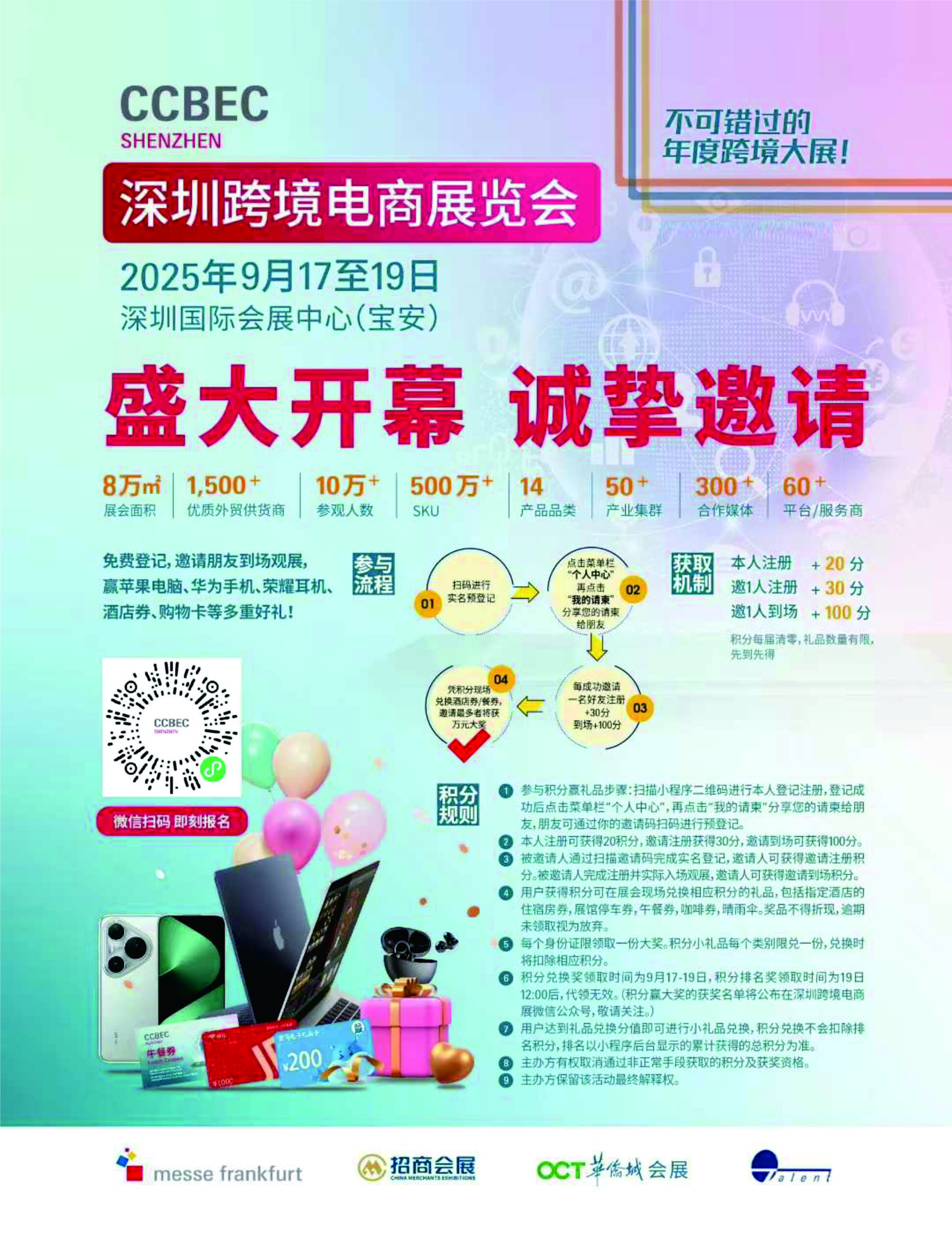 规模:8万平方米展出面积,预估10万+参观人数、1500家+优质外贸供货商,60+平台/服务商,50+产业集群,14大产品品类,500万+SKU,300+合作媒体,5大版块高峰论坛