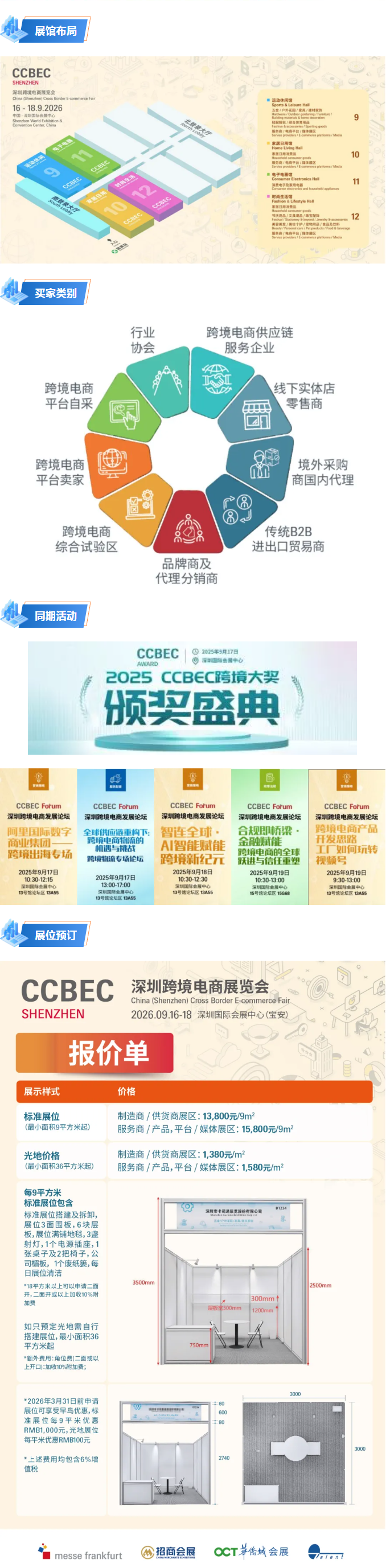 CCBEC深圳跨境电商展,凸显市场主体活跃优势。深圳,作为跨境电商的摇篮,汇聚了超15万家出口企业,其中亚马逊中国卖家1/3源自这里,展现了深圳在跨境电商领域的强大实力。2025深圳跨境电商博览会汇聚了众多行业精英,为参展商和观众提供了无限商机与合作可能。在2026深圳跨境电商展会,企业可以在深圳跨境展展示实力。CCBEC深圳跨境电商展2026,推动跨境电商行业蓬勃发展,共创辉煌未来。